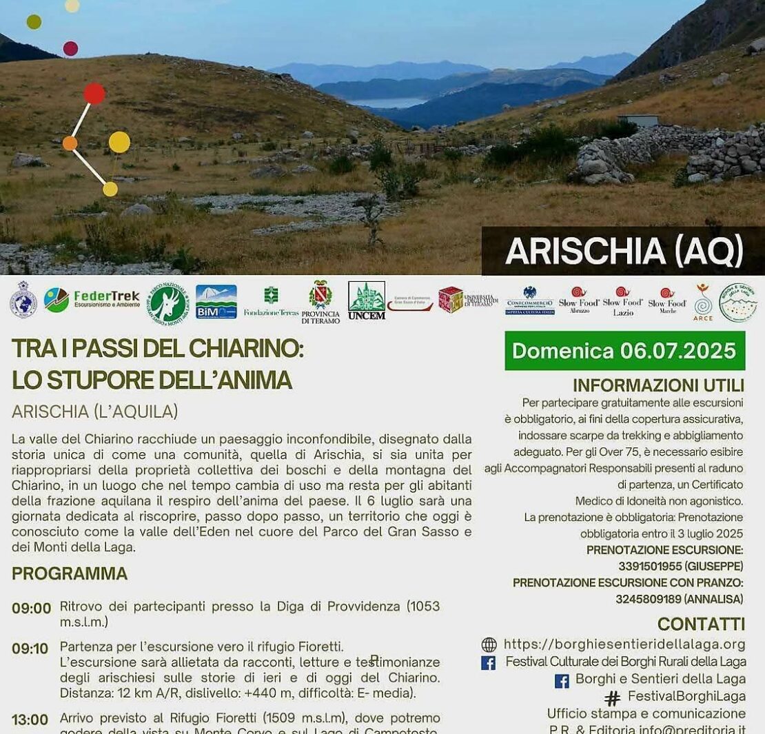 ● Il giorno seguente invece, un evento dedicato agli appassionati di escursionismo, che intende collegare idealmente il comprensorio dei Monti della Laga e quello del Gran Sasso, attraverso un itinerario naturalistico che prende il via dal Lago di Provvidenza, per inoltrarsi nella fresca e affascinante valle del Torrente Chiarino. Punto di arrivo è il solitario Rifugio Fioretti posto a 1500 metri di altitudine nel delizioso ripiano di pascolo del Piano del Castrato. Un luogo magico adatto per condividere racconti, letture, testimonianze e aneddoti, sulle inedite storie arischiesi.