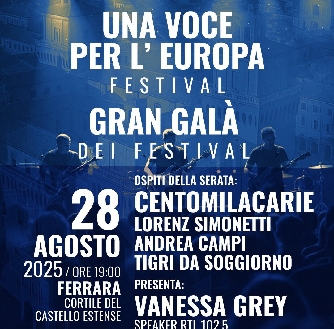 Giovedì 28 agosto dalle 19.00 si terranno le finali dei contest “A Voice for Europe – La voce per l’Europa – Italia” e “Gran Galà dei Festival” all’interno del Cortile del Castello Estense di Ferrara. L’evento sarà condotto da Vanessa Grey, speaker di RTL 102.5, e BeaMakk. Tra gli ospiti della serata ci sarà anche Centomilacarie, che presenterà un estratto del suo ultimo progetto “Io Nessuno”. Ingresso gratuito.