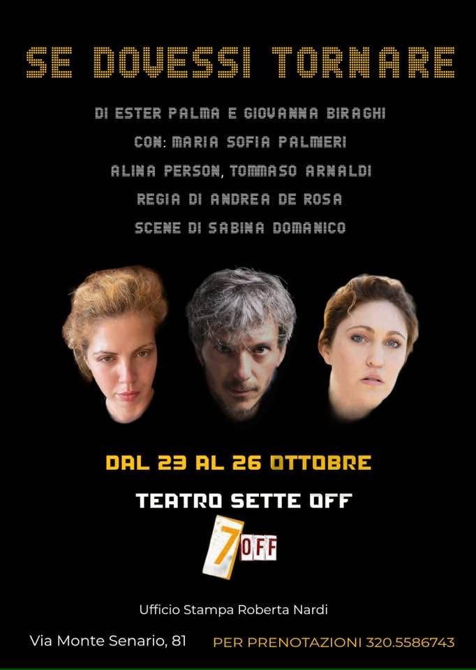 Il Teatro 7 Off di Roma ospiterà dal 23 al 26 ottobre la commedia “Se dovessi tornare”, uno spettacolo teatrale che ha già riscosso successo in precedenza e che vede sul palco l’attrice Maria Sofia Palmieri insieme a Tommaso Arnaldi e alla new entry Alina Person, con la regia di Andrea De Rosa.