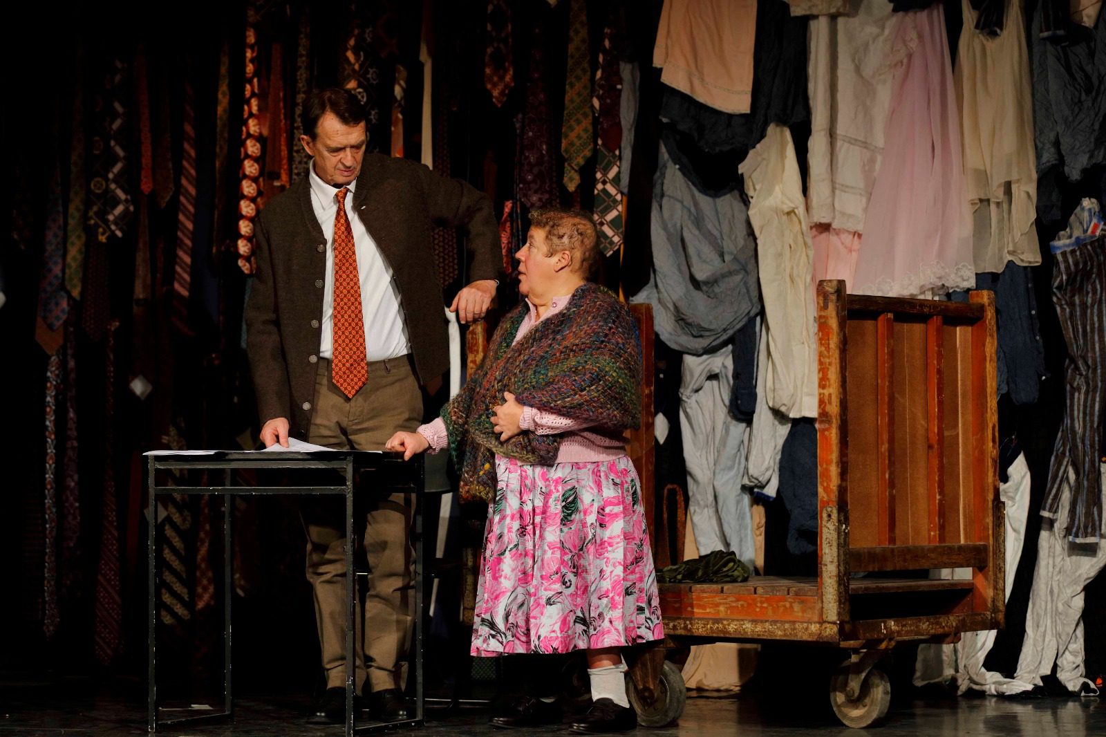 Alle spalle dei due attori, un sipario di cravatte. Un oggetto elegante, rassicurante, che contraddistingue l’uomo colto, lo scienziato autorevole, e che qui richiama tutti quei medici che si sarebbero dovuti occupare della salute delle persone, e che invece, forti della fiducia in loro riposta hanno convinto migliaia di famiglie a decretare la morte dei propri cari.