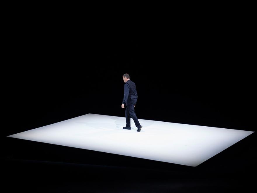 La scenografia è una grande pedana bianca inclinata, una enorme pagina bianca, su cuicamminando e sppostandosi Stefano Massini costruisce con la parola ed il movimento il suopercorso di formazione.